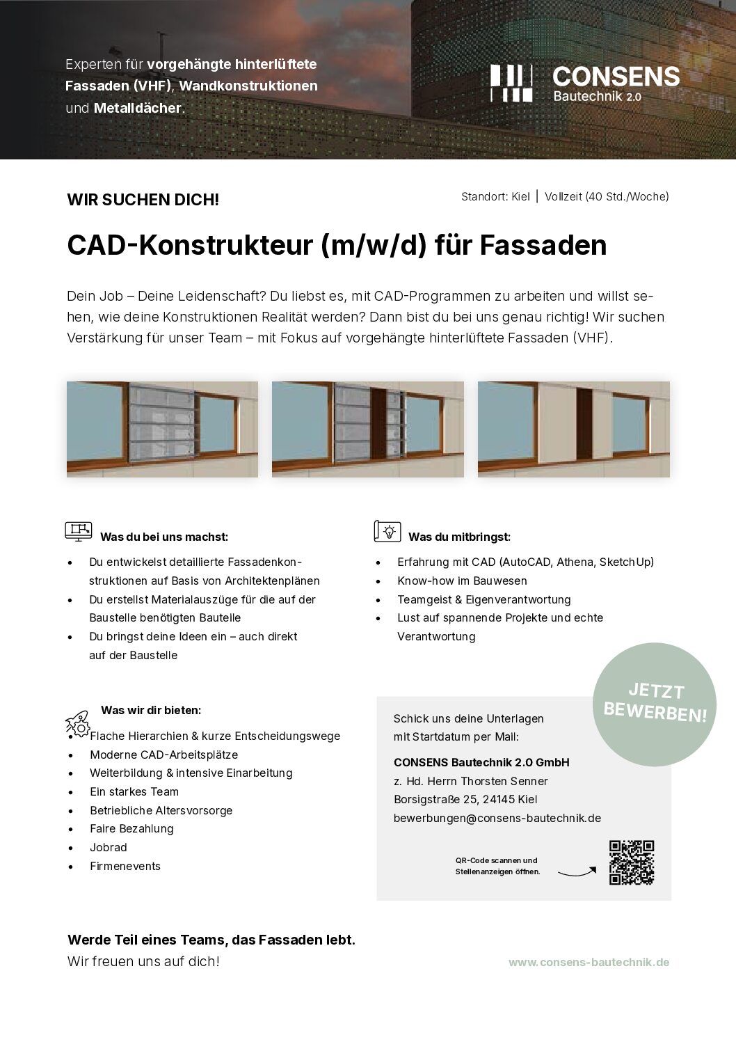 CONSENS steht für durchdachte Fassadenlösungen mit hohem architektonischem Anspruch und präziser technischer Umsetzung. Zur Verstärkung unseres Planungsteams in 𝗞𝗶𝗲𝗹 suchen wir eine:n engagierte:n 𝗖𝗔𝗗-𝗞𝗼𝗻𝘀𝘁𝗿𝘂𝗸𝘁𝗲𝘂𝗿:𝗶𝗻 (𝗺/𝘄/𝗱) – mit fundierter Erfahrung im Bereich vorgehängte, hinterlüftete Fassaden (VHF).